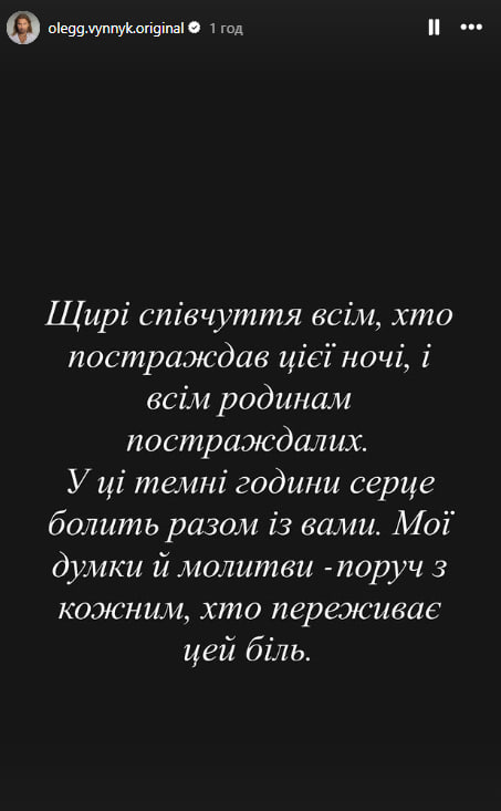 Український співак Олег Винник, який проживає в Німеччині, 9 січня в Instagram Stories розмістив пост зі співчуттями.