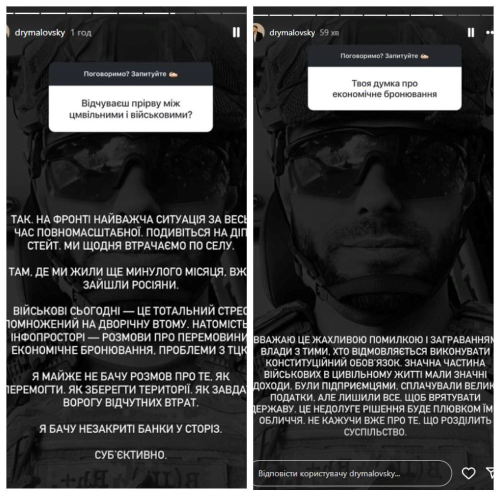 Український ведучий Орест Дрималовський, який служить у 79-й десантно-штурмовій бригаді, 7 жовтня в Instagram Stories висловився про економічне бронювання й прірву, яку відчуває між цивільними та військовими.