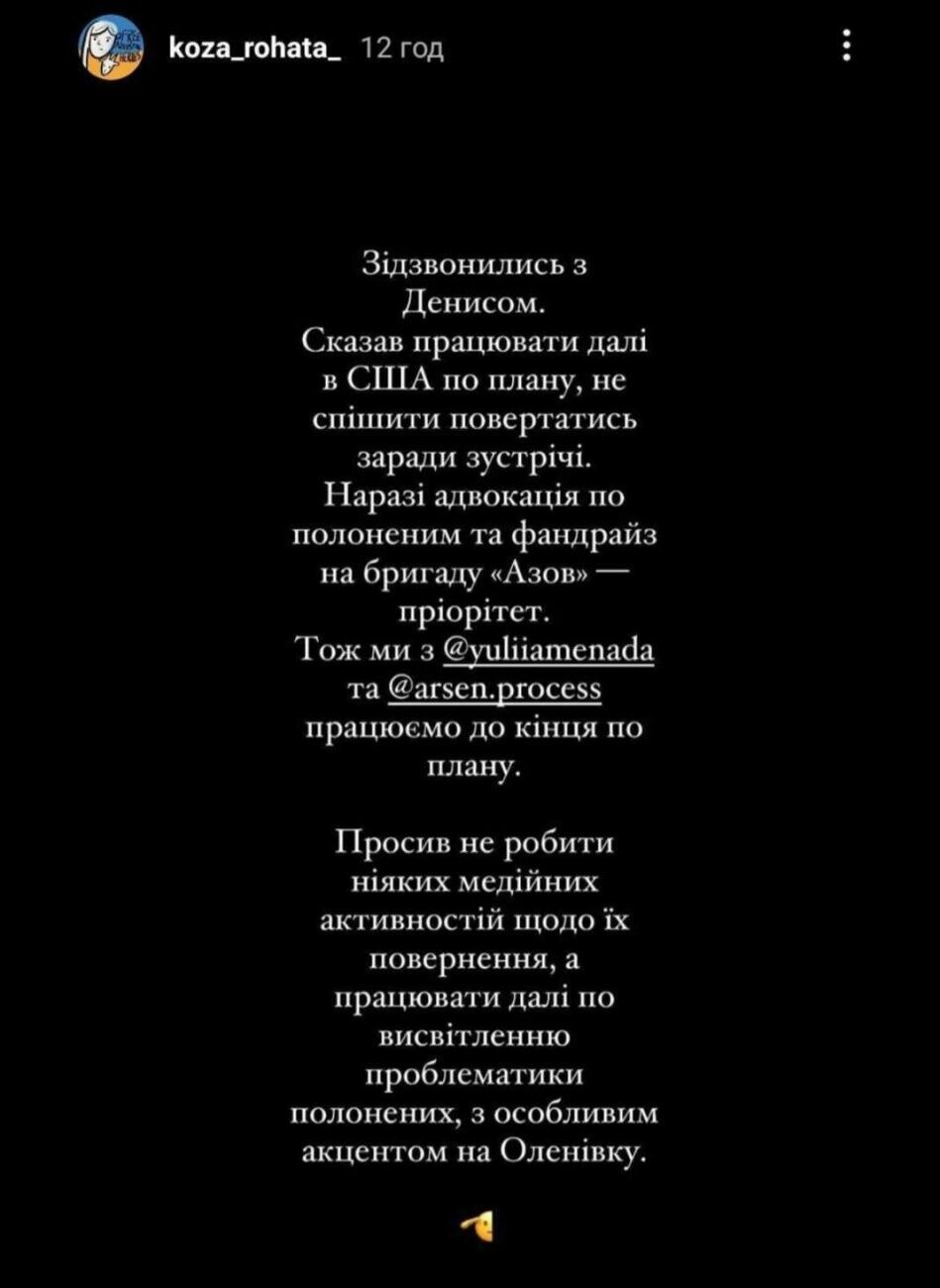 "Зідзвонилися з Денисом. Сказав працювати далі у США по плану, не поспішати повертатися заради зустрічі, – написала Катерина Прокопенко. – Просив не робити ніяких медійних активностей щодо їхнього повернення, а працювати далі по висвітленню проблематики полонених з особливим акцентом на Оленівку".