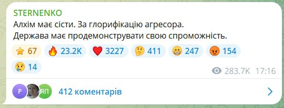 "Алхім має сісти. За глорифікацію агресора. Держава має продемонструвати свою спроможність", – написав він.