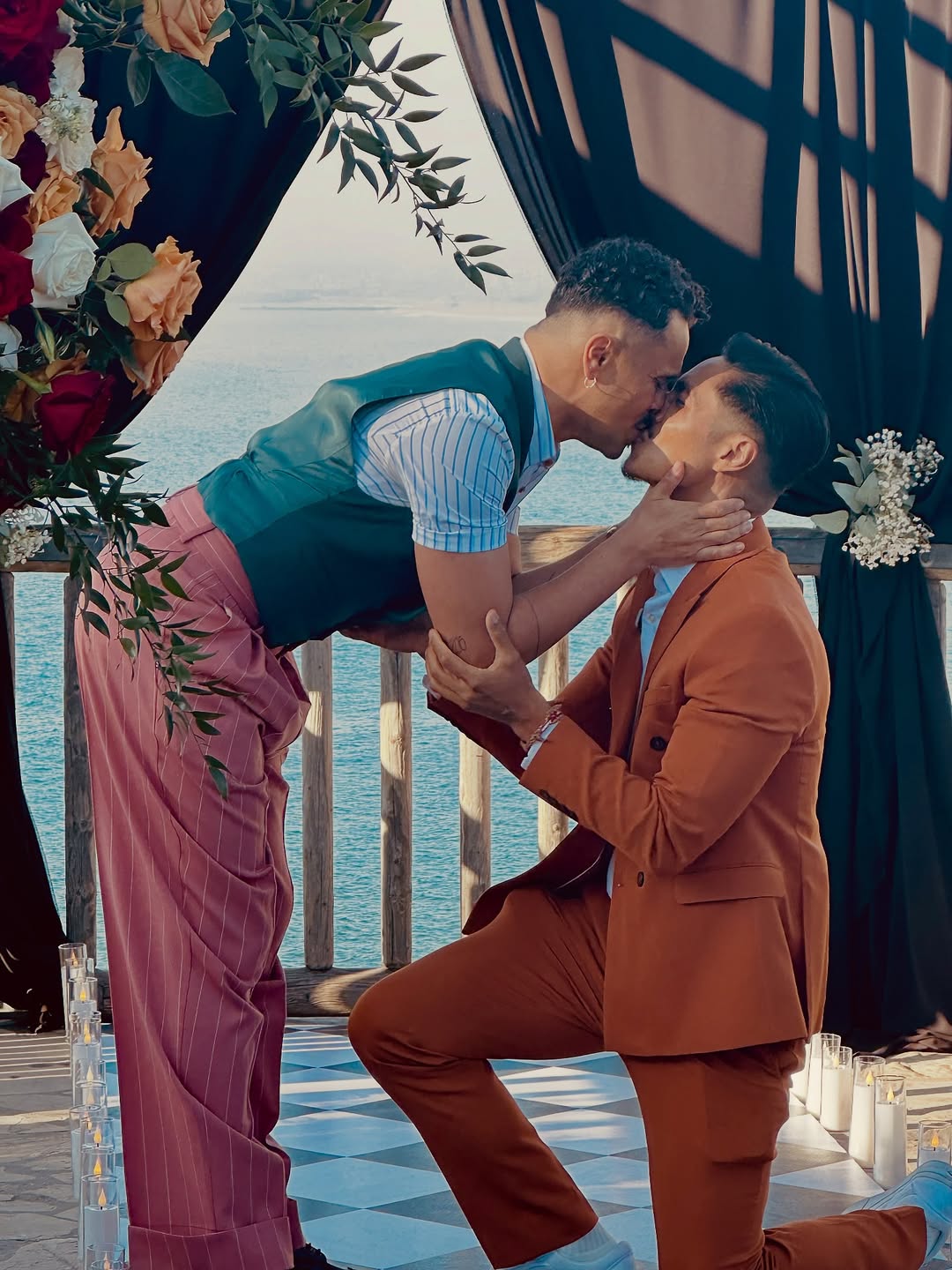 На одному зі знімків чоловіки цілуються в губи. Освідчення відбулося поблизу водойми серед свічок і композицій із квітами.