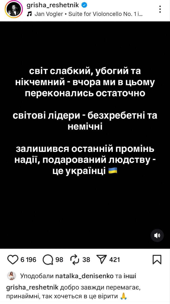 "Світ слабкий, убогий і нікчемний. Учора ми в цьому переконалися. Залишився останній промінь надії, подарований людству, – це українці", – зазначив він.