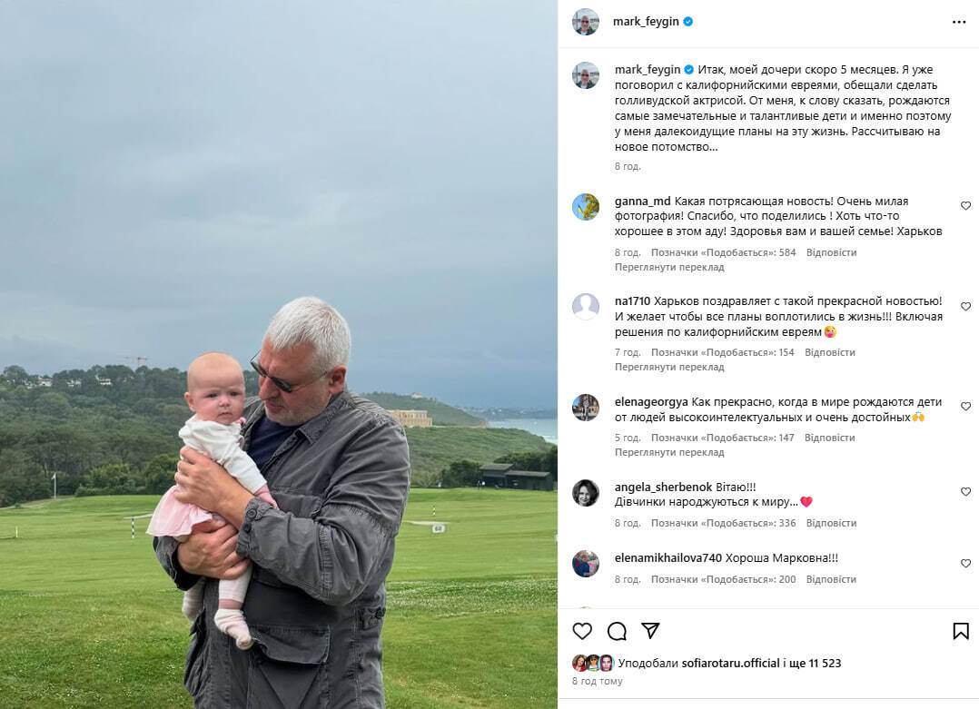 Українська співачка Софія Ротару однією з перших в українському шоу-бізнесі відреагувала на Instagram-пост 54-річного російського юриста і блогера Марка Фейгіна, у якому він повідомив, що чотири місяці тому в нього народилася донька.