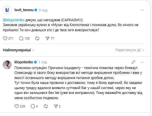 Незабаром він пояснив, що зʼясував ситуацію і зрозумів, чому Терен залишився без їжі. За словами Клопотенка, через блекаут сталася технічна помилка.