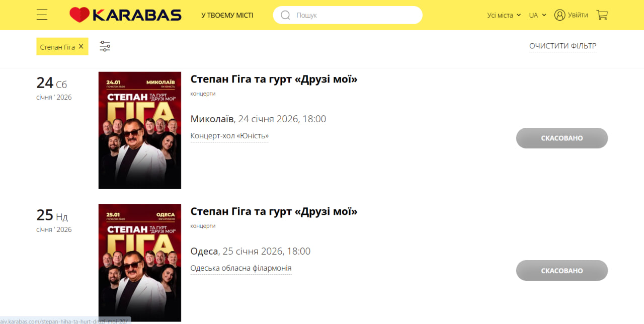 На тлі проблем зі здоров'ям усі концерти артиста, заплановані до кінця січня 2026 року, було скасовано, зокрема й виступ у київському Палаці спорту, який мав відбутися 29 листопада.