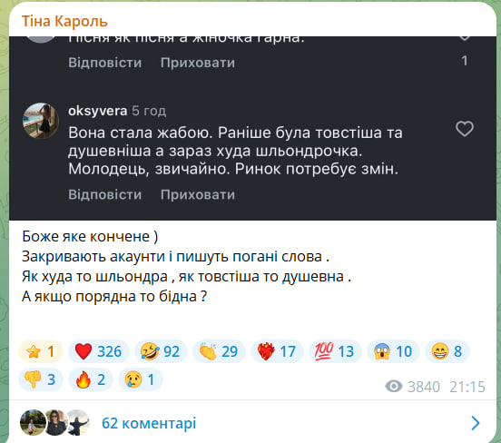 "Вона стала жабою. Раніше була товстіша й душевніша, а зараз худа шльондрочка. Молодець, звичайно. Ринок потребує змін", – написали хейтери.