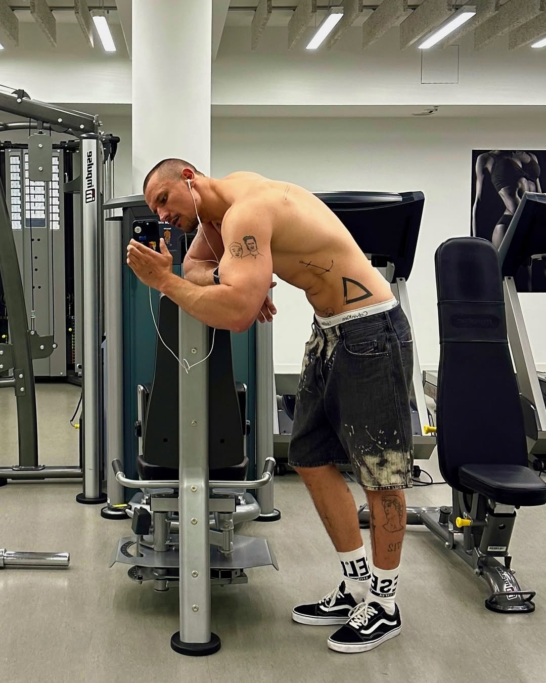 Фото зі спортзалу показує актора на повний зріст. Під час занять спортом актор позує з неприкритим торсом, демонструючи накачані м'язи на руках.