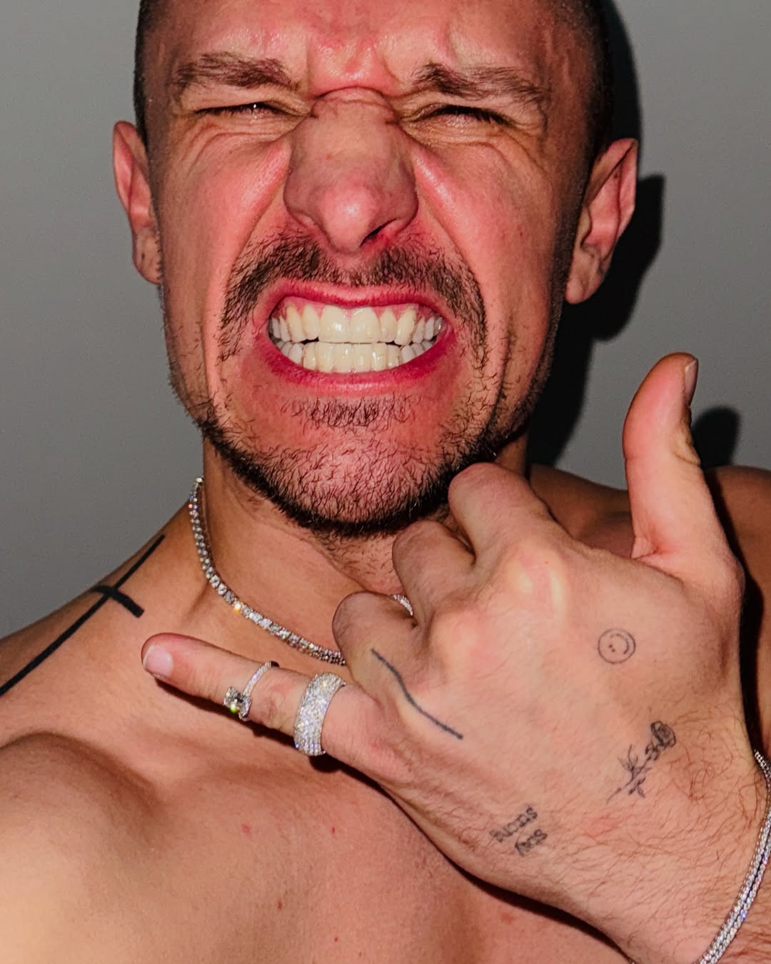 Портретне фото створює образ поганого хлопчика. Цимбалюк демонструє білосніжні зуби, а також діаманти в перснях, які надів на мізинець.