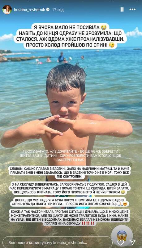 "Думала, що зі мною це не може трапитися. Але по факту це може трапитися з будь-ким. Від дітей у басейнах і водоймах узагалі не можна відходити", – додала Христина Решетнік.