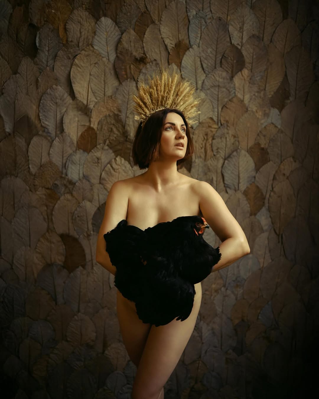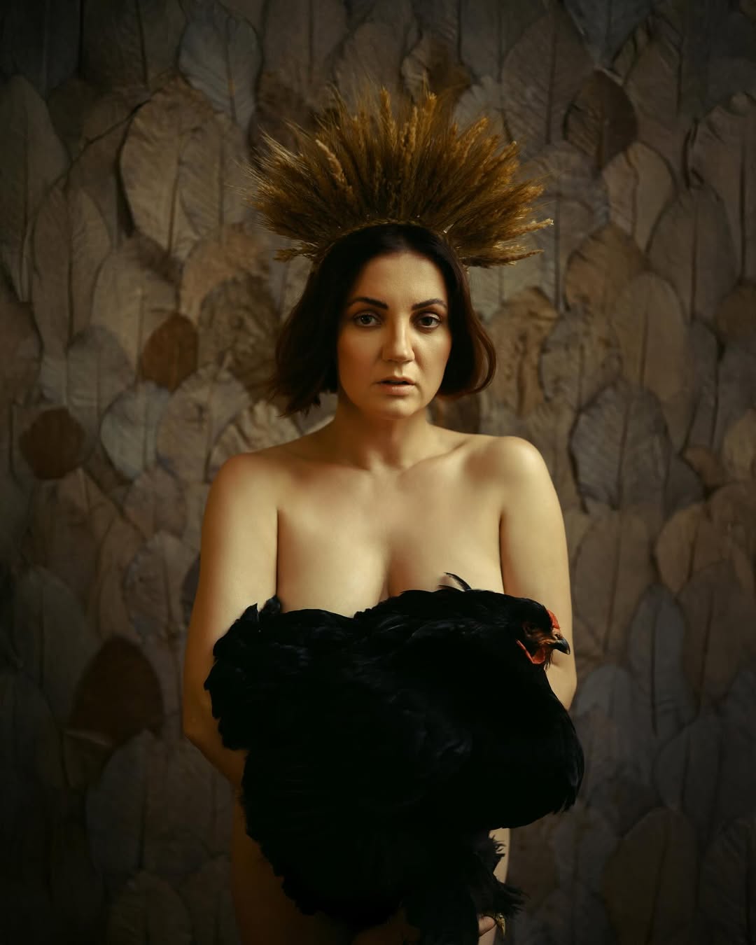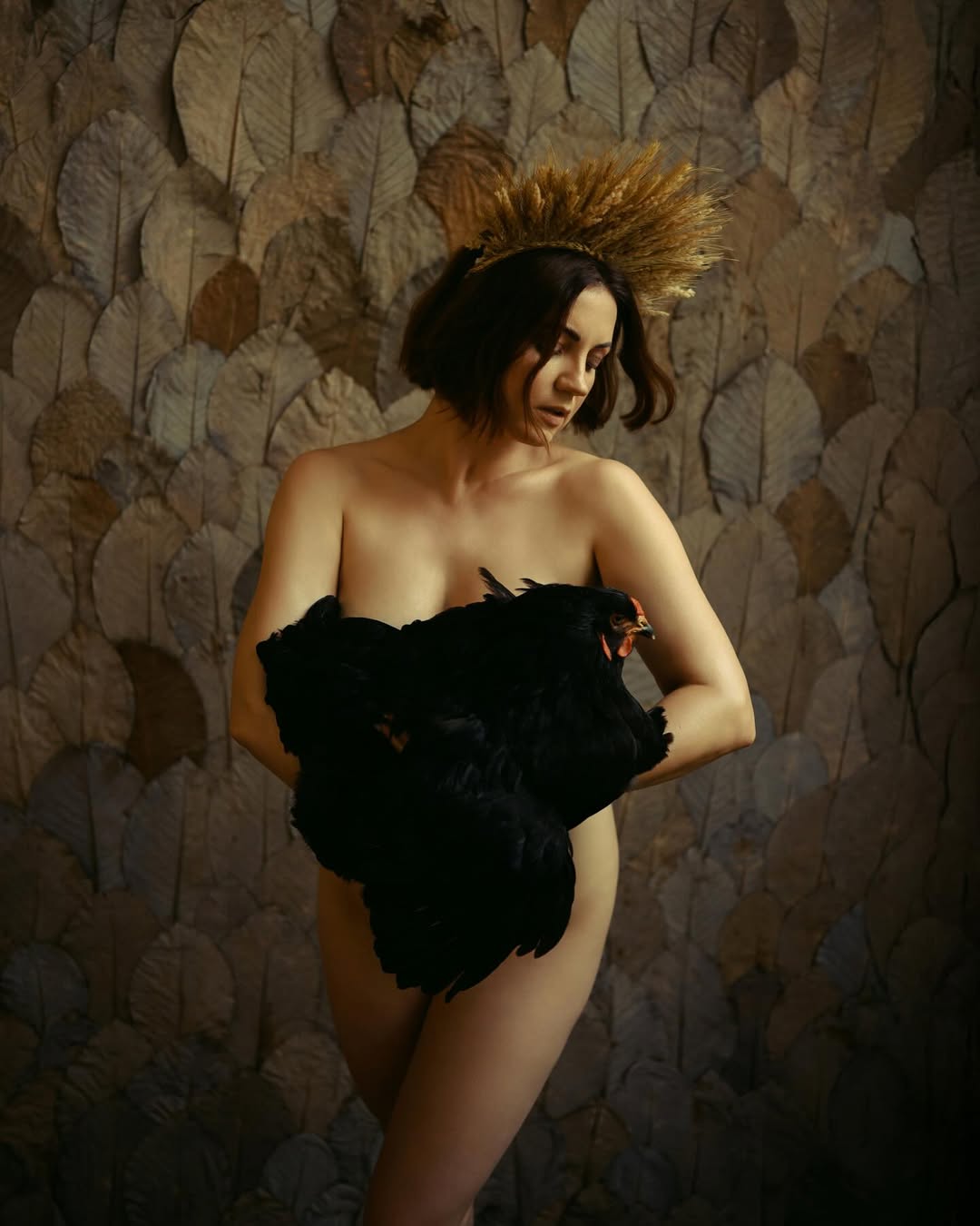Цибульська знялася без білизни й одягу, лише в головному уборі з колосся. Вона тримала в руках чорну курку.