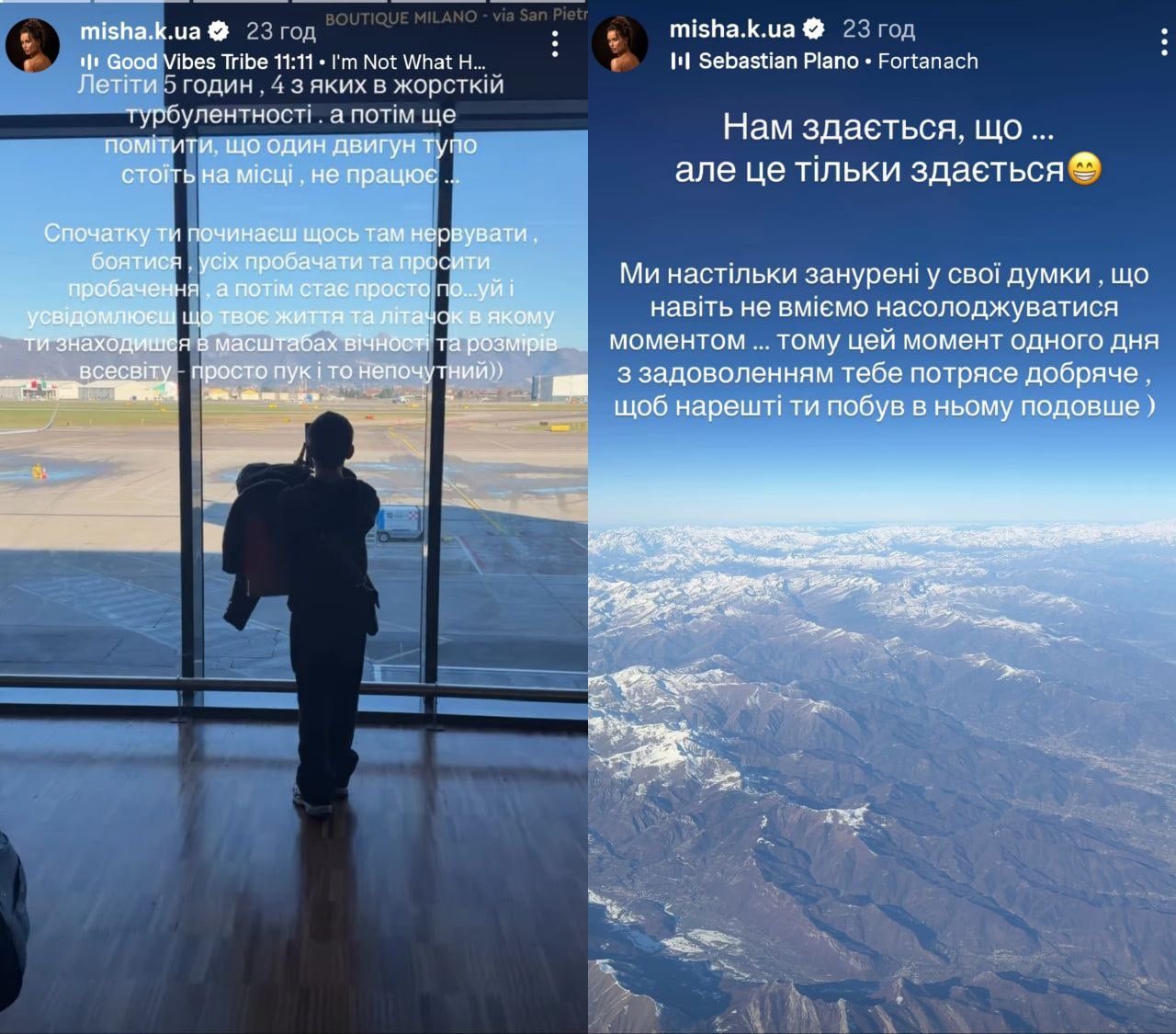 "А потім стає просто пох...й і усвідомлюєш, що твоє життя і літачок, у якому ти знаходишся, у масштабах вічності й розмірів Всесвіту – просто пук, і то не не почутий", – додала Мішина.