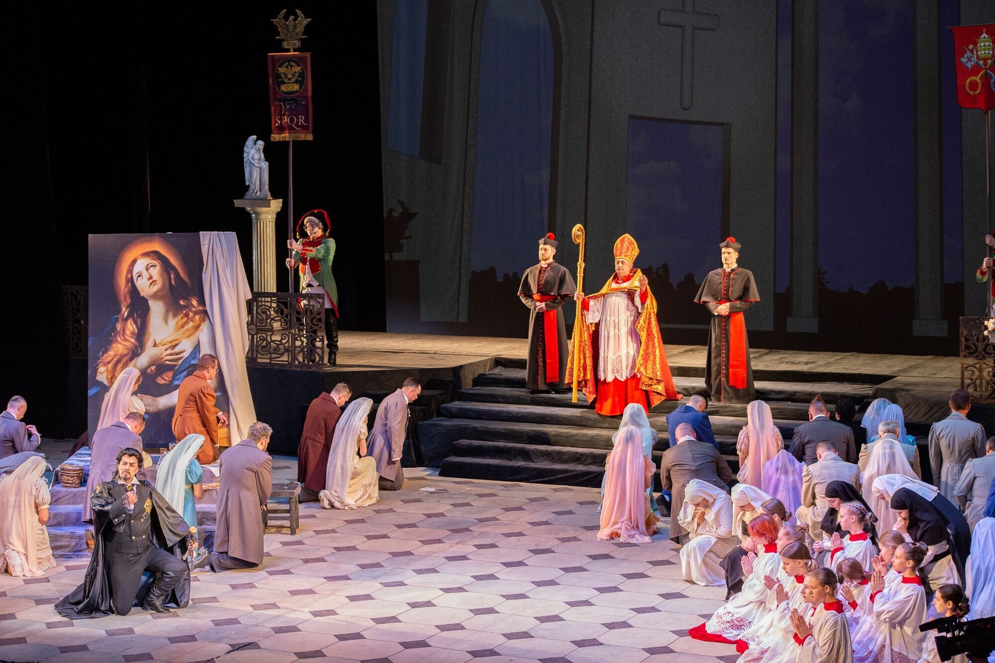 Ролі виконали: Флорія Тоска – Марія Максакова, Маріо Каварадоссі – Роман Коренцвіт, Скарпіа – Володимир Гудзь, Анджелотті – Володимир Бабенко, Ризничий – Максим Іващук, Сполетта – Андрій Поміщик, Шарроне – Олександр Прокопенко, Тюремник – Юрій Субот, Пастух – Тетяна Галкіна.