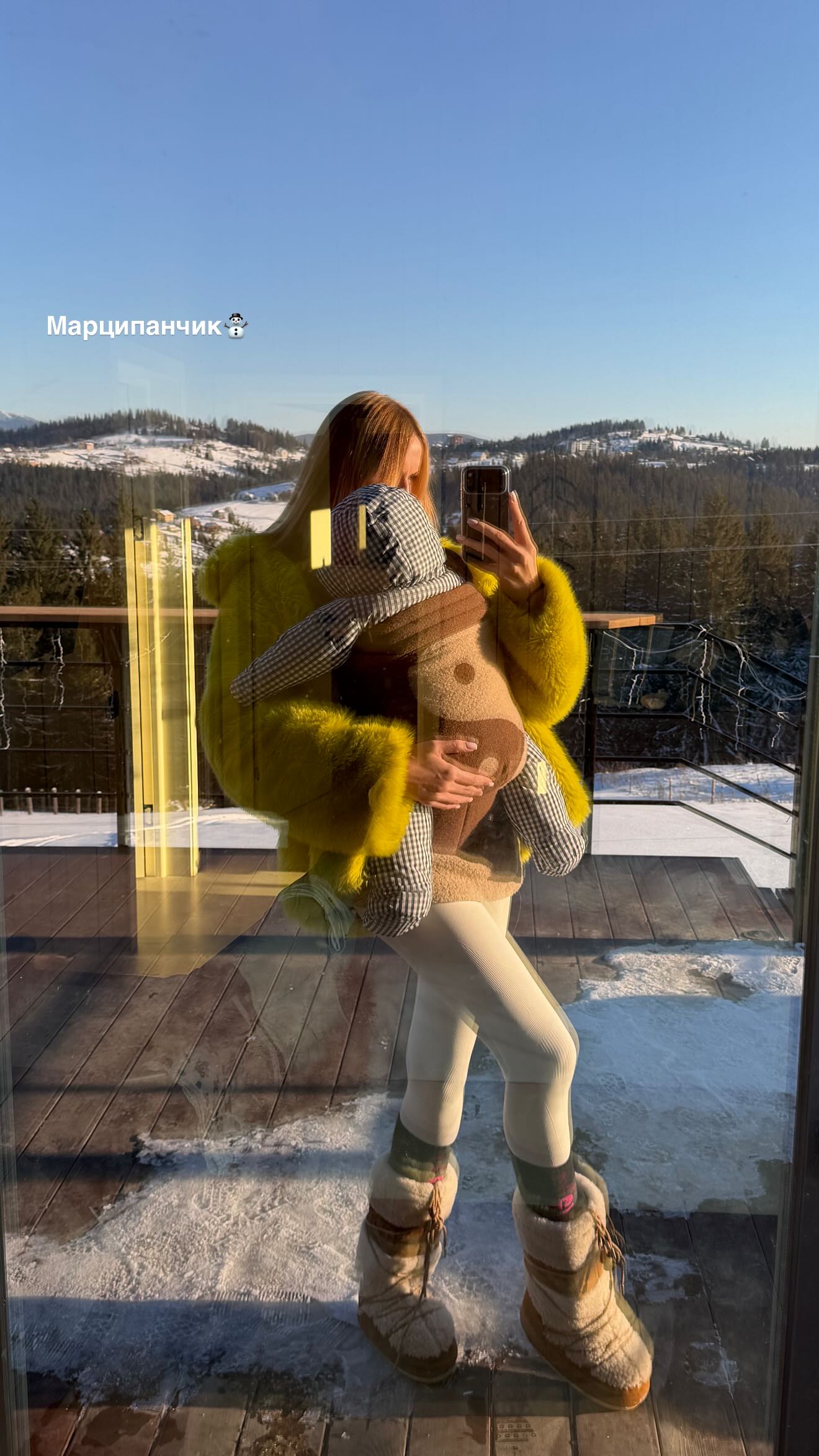 Телеведуча позувала в жовтій шубі, білих лосинах і чоботах у тон. На голову Нікітюк не стала надівати шапку, позуючи простоволосою. У слінгу вона тримала сина. Хлопчика ведуча вдягнула в картатий комбінезон.