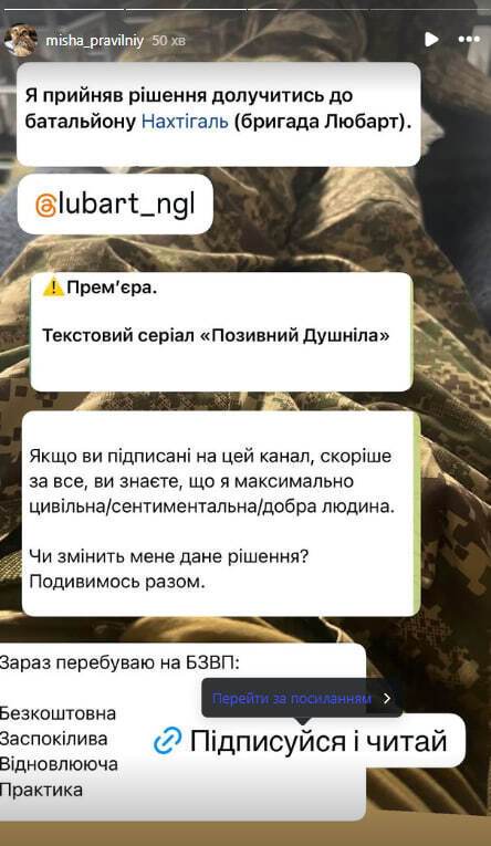 "Я прийняв рішення долучитися до батальйону "Нахтігаль" (бригада Любарт)", – написав він.