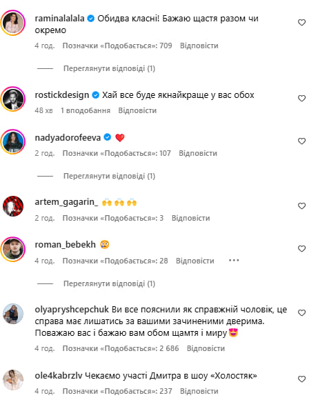 "Ніхто нікого не зрадив. Не обманув. Не пішов до іншого чи іншої. Розходимось із повагою одне до одного. Це зважене рішення двох дорослих людей. І все, що було в нашому спільному житті, залишається тільки нашим, між нами двома. За зачиненими дверима сім'ї, яку нам не вдалося зберегти. Але ми залишаємося друзями, не припиняємо спілкування, у нас все ок із людськими стосунками. Просто тепер вони не сімейні", – пояснив ведучий.