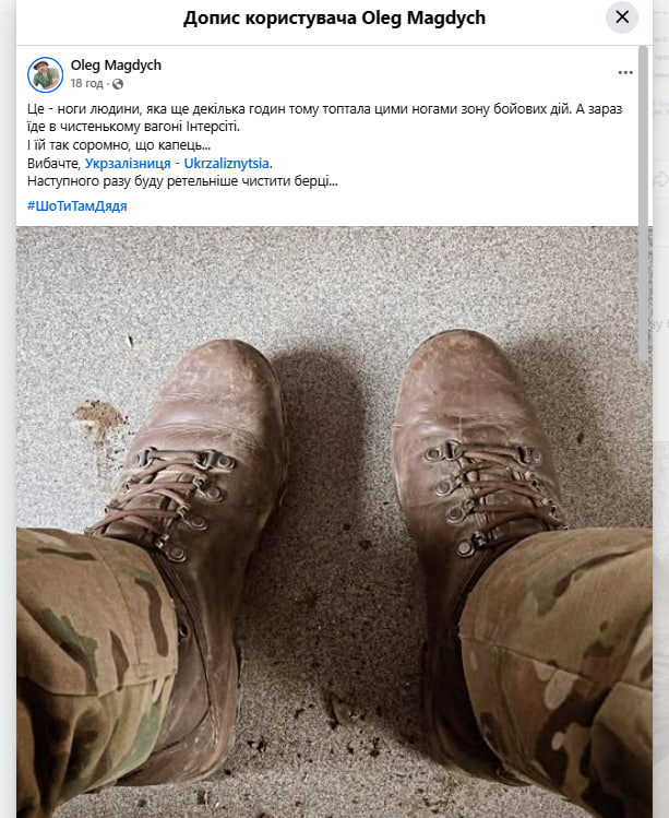 Український військовослужбовець Олег Магдич 7 квітня розмістив у Facebook фото своїх ніг у берцях і звернувся до "Укрзалізниці" з вибаченнями за те, що погано почистив взуття. Відповідь компанії зворушила військового.