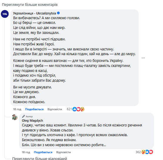 "Сиджу, читаю ваш комент. Хвилини три читав. Бо після кожного речення дивився у вікно. Ховав сльози. І тут підходить хлопчина з кафе, пропонує всяких смаколиків. Безкоштовно. Як подяка воїнам. Блін. Що ви з моєю нервовою системою робите..." – написав Магдич.
