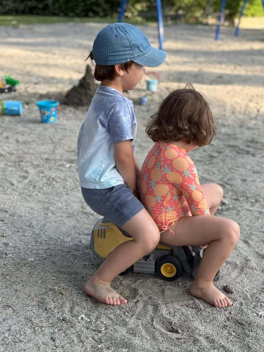 Він показав фото, на якому його син і донька позують, сидячи на дитячій іграшці.