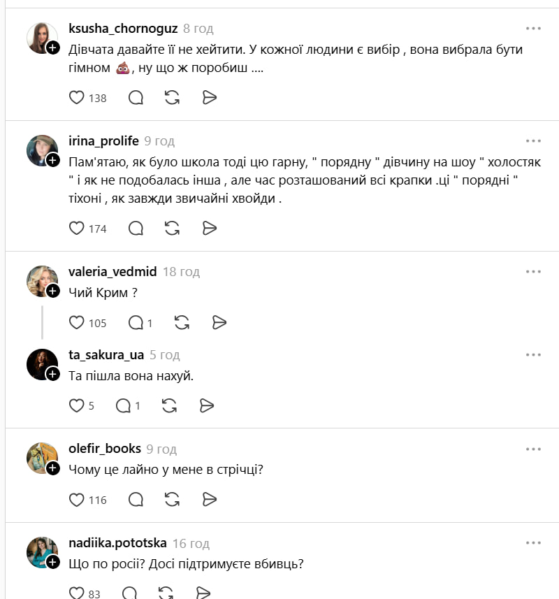 "У кожної людини є вибір. Вона вибрала бути гівном, ну, що ж поробиш", – прокоментували пост українці.
