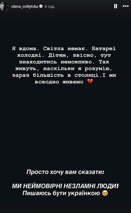 "Я вдома. Світла немає. Батареї холодні. Дітям, звісно, тут знаходитися неможливо. Так живуть, наскільки я розумію, зараз більшість у столиці. І ми все одно живемо", – написала вона.