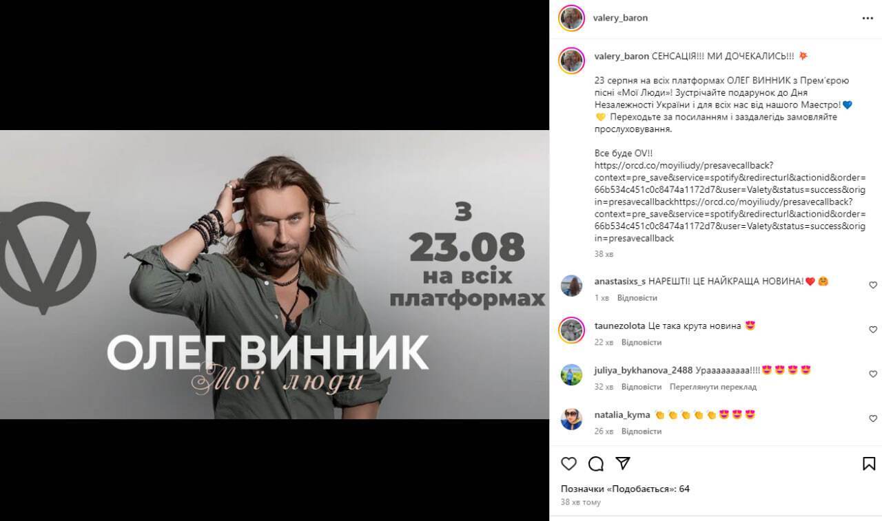 "Сенсація. Ми дочекалися. Зустрічайте подарунок до Дня Незалежності України і для всіх нас від нашого маестро!" – прокоментувала новину Барон.