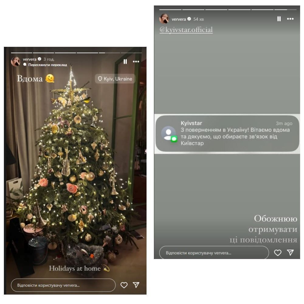 Українська співачка Віра Брежнєва на новорічні свята повернулася додому в Київ. Про це вона повідомила 28 грудня, розмістивши в Instagram Stories фото свого будинку з новорічним декором.