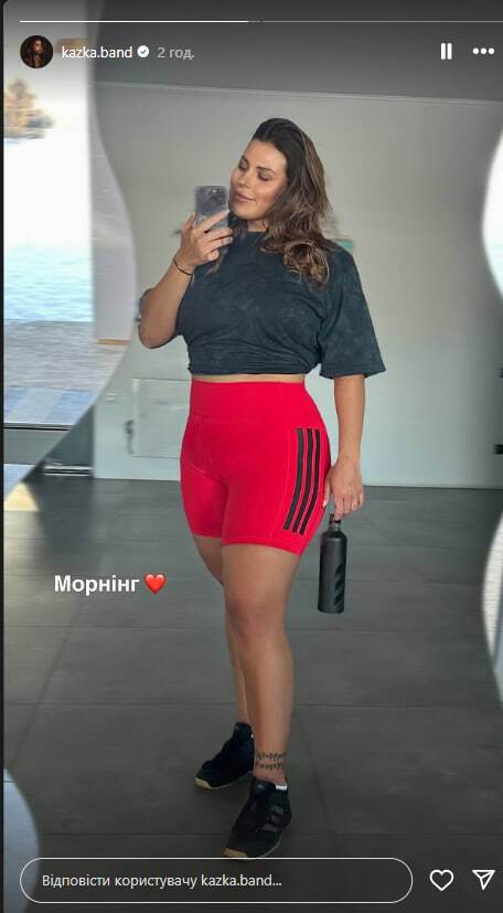 Солістка українського гурту Kazka Олександра Заріцька 18 лютого опублікувала в Instagram Stories селфі, на якому її знято в шортах і короткій футболці під час тренування.