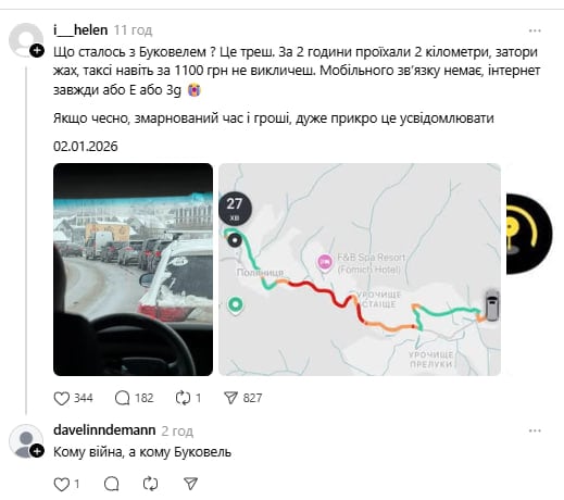 "Що сталося з Буковелем? Це треш. За дві години проїхали 2 км, затори – жах, таксі навіть за 1,1 тис. грн не викличеш. Якщо чесно, змарнований час і гроші, дуже прикро це усвідомлювати", – поскаржилися в мережі.