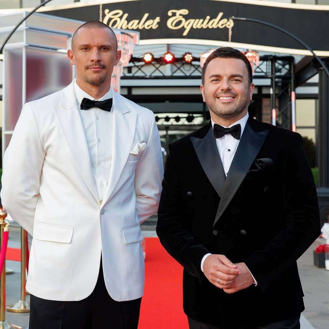 На опублікованому фото новий холостяк позує в чорних штанах, сорочці й піджаку білого кольору. Поряд з артистом стоїть ведучий шоу, український журналіст Григорій Решетнік.