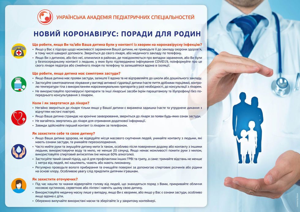 Громадська організація "Українська академія педіатричних спеціальностей" опублікувала поради для батьків у зв'язку зі світовою пандемією коронавірусу. Зокрема, УАПС рекомендує батькам і дітям уникати місць масового скупчення людей, частіше мити руки і прибирати вдома, щоб уникнути зараження грипом, ГРВІ або коронавірусом. Якщо під час симптомів ГРВІ у дитини спостерігають задишку (дихальна недостатність – одне з найпоширеніших ускладнень під час коронавірусної інфекції), УАПС радить негайно звернутися до лікаря.
