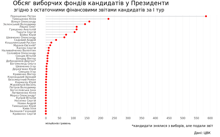 На вибори президента України 2019 року кандидати витратили загалом понад 1,7 млрд грн. Про це з посиланням на дані Центральної виборчої комісії повідомляє рух "Чесно". Найвитратнішою виявилася кампанія чинного глави держави Петра Порошенка – майже 600 млн. На другому і третьому місцях із понад удвічі меншими сумами – лідер партії "Батьківщина" Юлія Тимошенко і нардеп від Опозиційного блоку Олександр Вілкул. Переможець виборів Володимир Зеленський витратив майже 150 млн грн. За інформацією "Чесно", основні статті витрат кандидатів – зовнішня і телевізійна реклами. Витрат на соціальні мережі у звітах майже немає, ідеться в повідомленні руху.