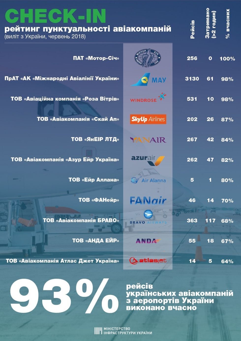 Лідером рейтингу пунктуальності авіакомпаній стала "Мотор Січ", із 256 здійсненних у червні рейсів 100% було виконано вчасно. Друге місце в МАУ: 98% із 3130 рейсів – без запізнень. На третьому місці – авіакомпанія "Роза Вітрів", у червні вона виконала 531 рейс, із яких 98% завершилися вчасно. Інфографіку опубліковано на сайті міністерства 12 липня.