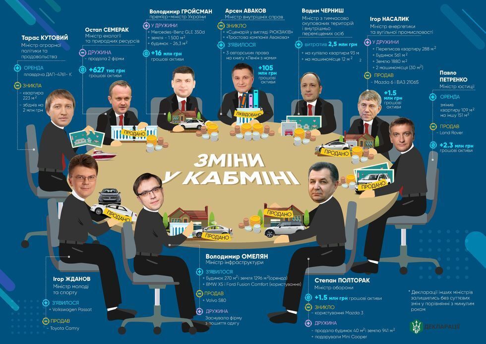 У 2017 році низка членів Кабінету Міністрів і члени їх сімей придбали нові автомобілі та нерухомість, а також збільшили грошові активи. Декларації міністрів проаналізував проект "Декларації" (Bihus.info). Дружина прем'єр-міністра Володимира Гройсмана Олена купила у 2017 році автомобіль Mercedes-Benz GLE 350d, отримала у спадок 1,5 тис. м² землі та житловий будинок у Вінниці площею 26,3 м². Грошові активи сім'ї за 2017 рік зросли на 16 млн грн. Міністр внутрішніх справ Арсен Аваков задекларував авторські права на українську, російську та англійську версії своєї книги "Ленін з нами?" Він став лідером серед міністрів щодо зростання грошових активів — за рік його статок зріс на 105 млн грн. У міністра з питань тимчасово окупованих територій і внутрішньо переміщених осіб Вадима Черниша у 2017 році з'явилися квартира та машиномісце.