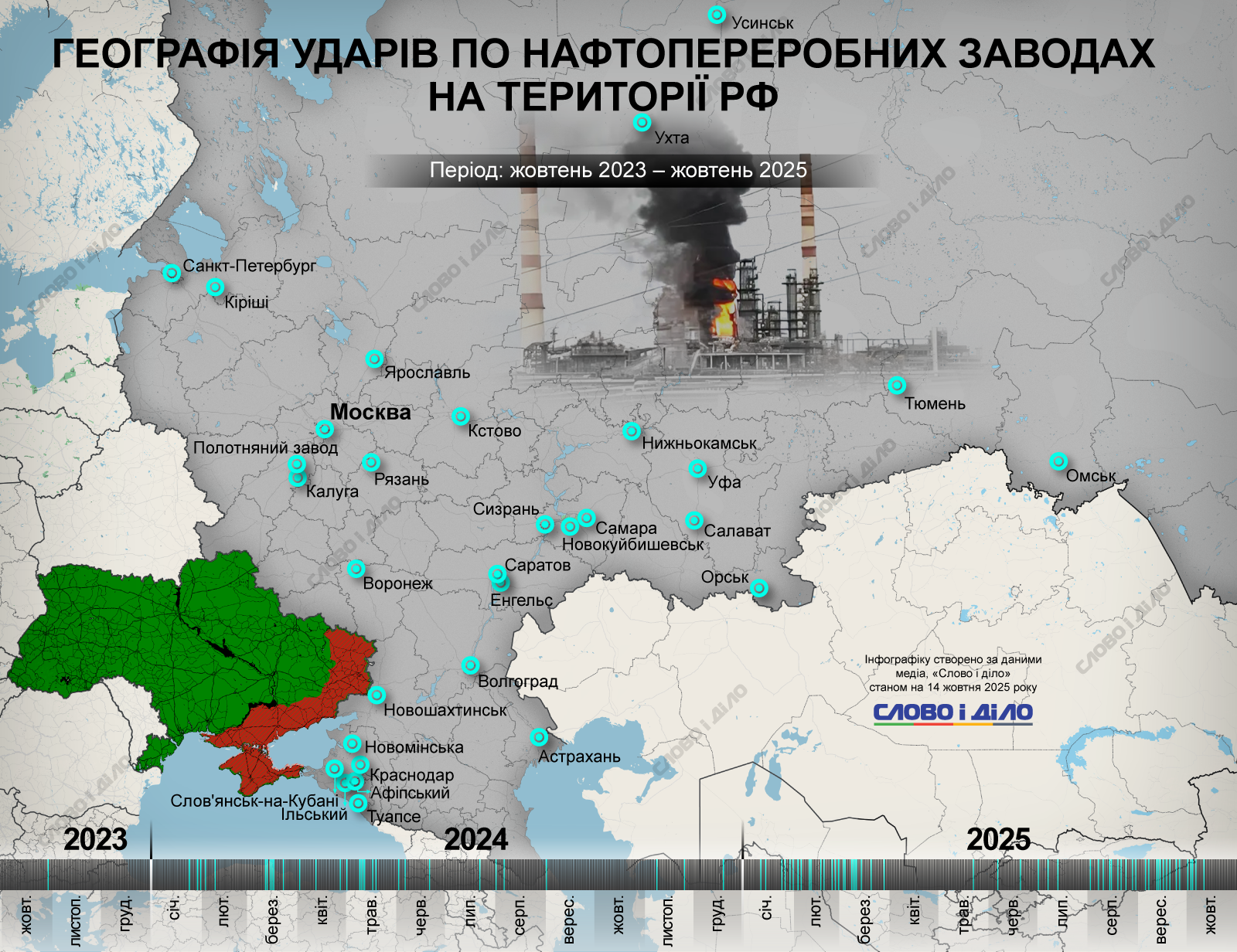 Із жовтня 2023 року Збройні сили України завдали понад 100 ударів по нафтопереробних заводах і нафтобазах країни-агресора Росії. Про це свідчать дані аналітичного проєкту "Слово і діло", який 14 жовтня склав карту географії українських атак.