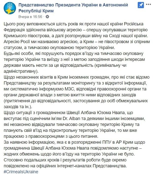 У представництві президента України в Автономній Республіці Крим заявили, що працюють із правоохоронними органами через ситуацію зі шведським музикантом Dr. Alban та іншими іноземцями, які відвідували анексований Росією Крим і планують свій в'їзд на підконтрольну Києву територію України.