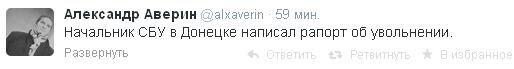 19.07 Глава СБУ в Донецьку подав у відставку – повідомляє у Twitter Олександр Аверін, член виконкому коаліції "Другая Россия" і один з організаторів "Марша несогласных". Сьогодні проросійськи налаштовані активісти в Донецьку штурмували будівлю СБУ.