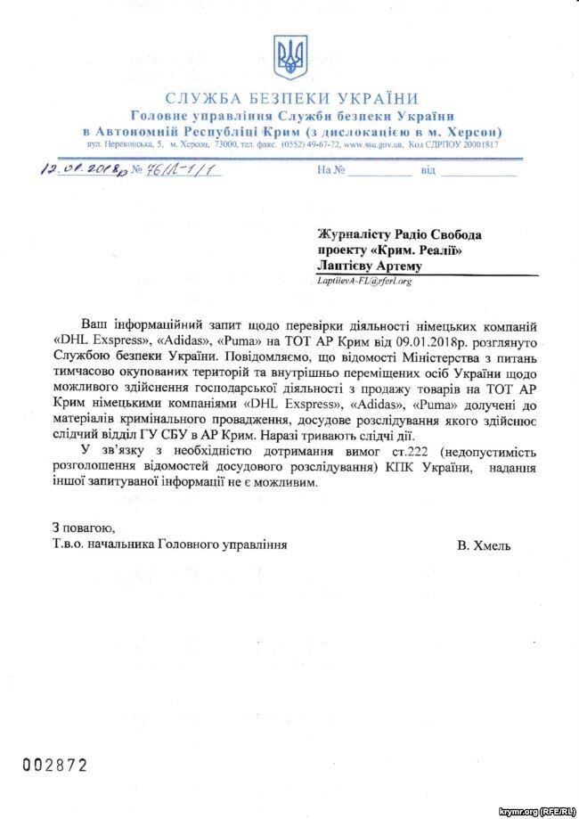 Головне управління Служби безпеки України в Автономній Республіці Крим проводить досудове слідство в межах кримінальної справи про можливу роботу німецьких компаній DHL Express, Adidas і Puma на анексованому півострові. Про це йдеться у відповіді відомства на запит видання "Крим.Реалії", яку опублікували 12 січня.