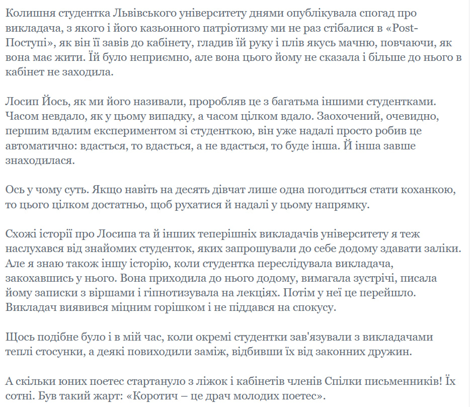"Колишня студентка Львівського університету днями опублікувала спогад про викладача, як він її завів до кабінету, гладив їй руку і плів якусь маячню, повчаючи, як вона має жити. Їй було неприємно, але вона цього йому не сказала й більше до нього в кабінет не заходила, – написав він. – Лосип Йось, як ми його називали, проробляв це з багатьма іншими студентками. Часом невдало, як у цьому випадку, а часом цілком вдало. Заохочений, очевидно, першим вдалим експериментом зі студенткою, він уже надалі просто робив це автоматично: вдасться, то вдасться, а не вдасться, то буде інша. Й інша завше знаходилася. Ось у чому суть. Якщо навіть на 10 дівчат лише одна погодиться стати коханкою, то цього цілком достатньо, щоб рухатися й надалі в цьому напрямку".