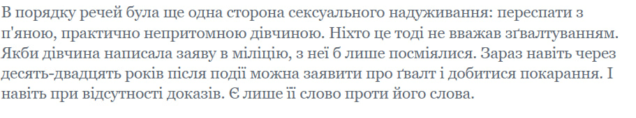 "У порядку речей була ще одна сторона сексуального надуживання: переспати з п'яною, практично непритомною дівчиною. Ніхто це тоді не вважав зґвалтуванням. Якби дівчина написала заяву в міліцію, з неї б лише посміялися, – додав письменник. – Зараз навіть через 10–20 років після події можна заявити про ґвалт і добитися покарання. І навіть при відсутності доказів. Є лише її слово проти його слова".