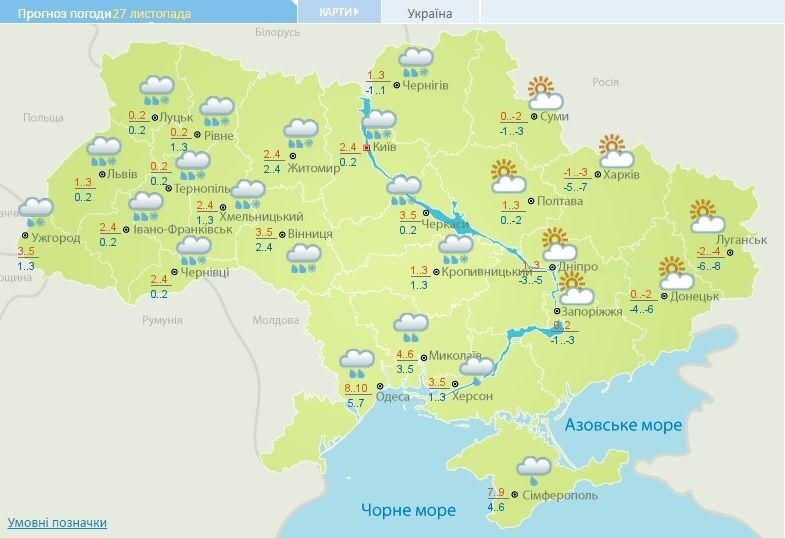 29 листопада мокрий сніг із дощем очікують на всій території України. Заморозки до -2° вночі на заході та півночі країни. У східних областях похолоднішає до -7°.