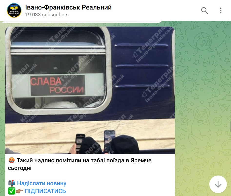 Напис помітили вранці, коли поїзд зупинився у Яремчі Івано-Франківської області. Відповідне фото опублікував місцевий Telegram-канал "Івано-Франківськ Реальний".