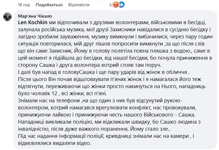 "Ми відпочивали із друзями волонтерами, військовими в бесідці, залунала російська музика, мої друзі захисники навідалися в сусідню бесідку і лагідно зробили зауваження, музику вимкнули і вибачилися, через пару годин ситуація повторилася, мій друг пішов попросити вимкнути, за що після слів, що він саме захисник, йому в голову полетіла повна пляшка з водою. [...] Далі був напад у голову Сашка і ще пару ударів від жінок в обличчя", – написала вона.