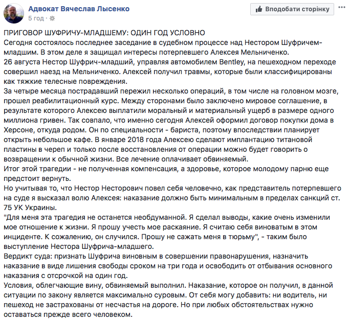 "Вердикт суду: визнати Шуфрича винним у вчиненні правопорушення, призначити покарання у вигляді позбавлення волі строком на три роки і звільнити від відбування основного покарання з відстрочкою на один рік. Умови, що полегшують вину, обвинувачений виконав. Покарання, яке він одержав, у цій ситуації за законом є максимально суворим", – написав він.