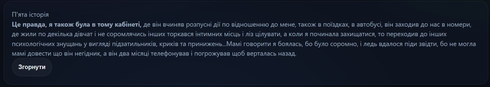 "Це правда, я також була в тому кабінеті, де він вчиняв розпусні дії по відношенню до мене, також у поїздках, в автобусі, він заходив до нас у номери, де жило по декілька дівчат, і, не соромлячись інших, торкався інтимних місць і ліз цілувати, а коли я починала захищатися, то переходив до інших психологічних знущань у вигляді підзатильників, криків та принижень..." – ідеться в одній з опублікованих історій.