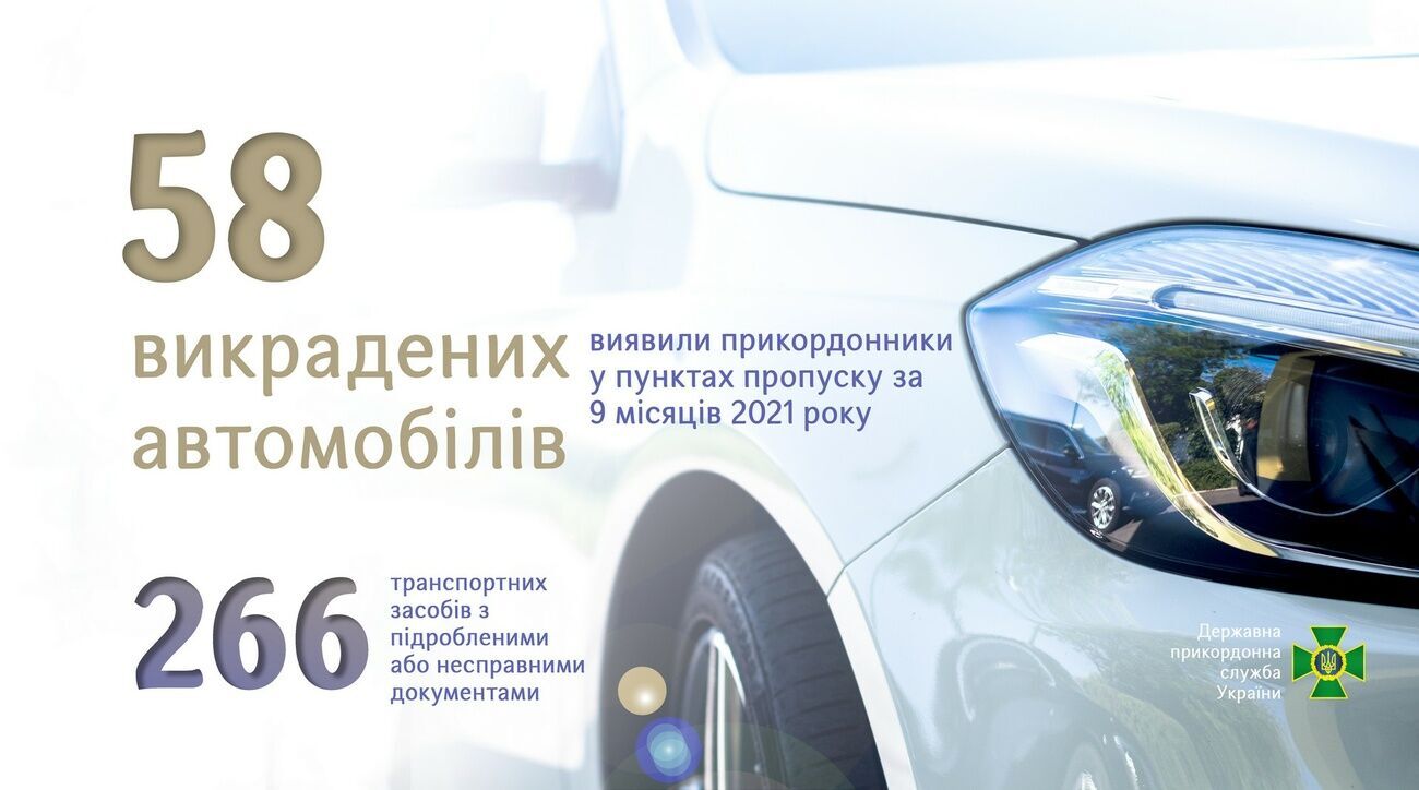 Упродовж дев'яти місяців 2021 року українські прикордонники виявили 58 викрадених автомобілів і 266 із підробленими й несправними документами. Про це 18 жовтня повідомила пресслужба Міністерства внутрішніх справ України.