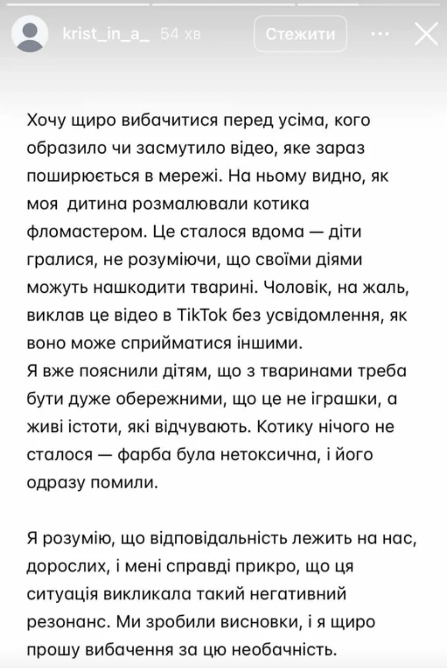 "Це сталося вдома – діти гралися, не розуміючи, що своїми діями можуть нашкодити тварині. Чоловік, на жаль, виклав відео у TikTok без усвідомлення, як воно може сприйматися іншими. Я вже пояснила дітям, що з тваринами треба бути дуже обережними, що це не іграшки, а живі істоти, які відчувають. Котику нічого не сталося, фарба була не токсична, і його одразу помили. Я розумію, що відповідальність лежить на нас, дорослих. І мені справді прикро, що ситуація викликала такий негативний резонанс. Ми зробили висновки, і я щиро прошу вибачення за цю необачність", – розповіла мама.