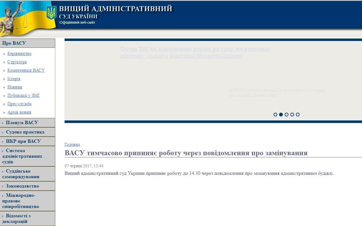 7 червня "Інтерфакс-Україна" повідомило, що на сайті Вищого адміністративного суду України з'явилася інформація про спалах, через який судова інстанція тимчасово припинила роботу. Також повідомляли про евакуацію працівників суду та відвідувачів.