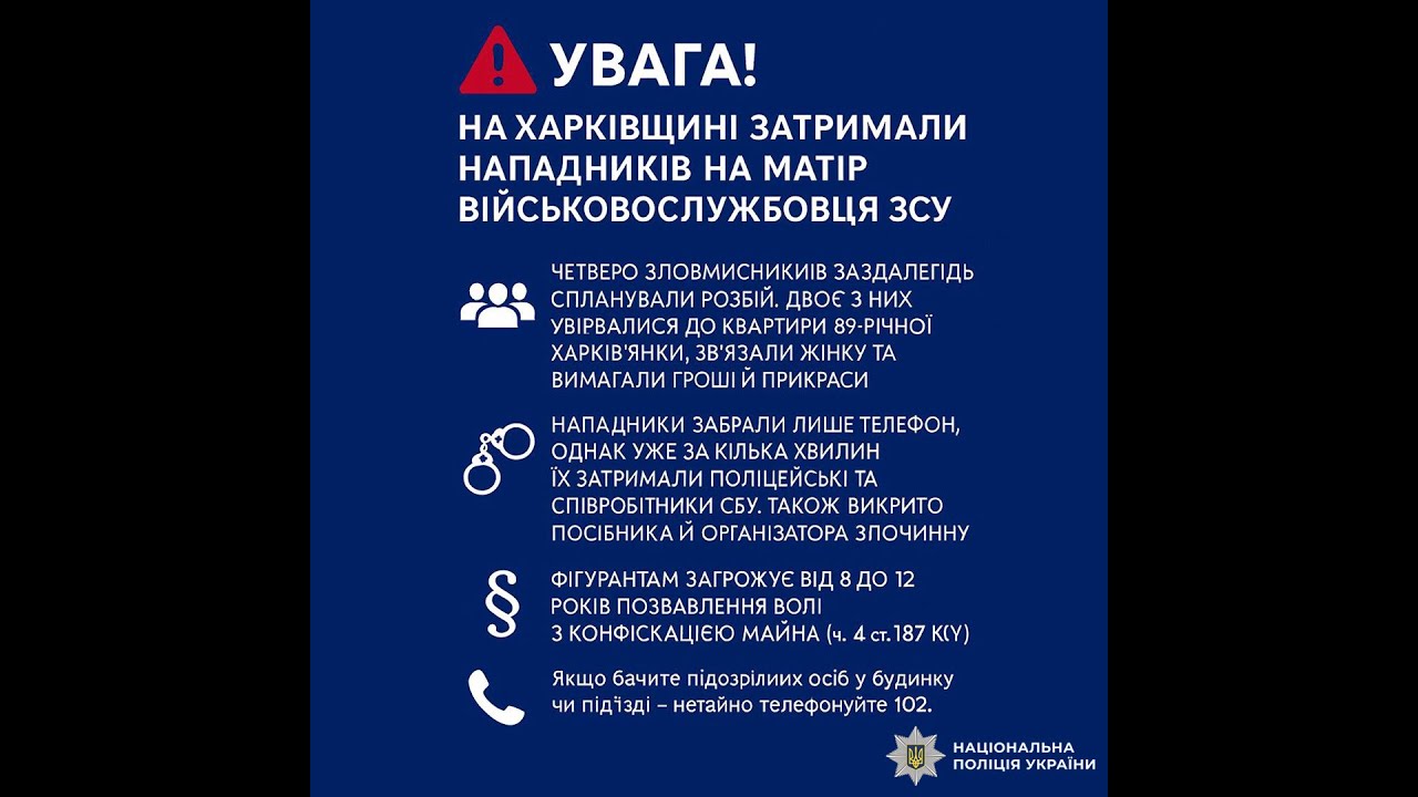 За інформацією Харківської обласної прокуратури, фігуранти були переконані, що жінка зберігає у квартирі приблизно $50 тис., які, за їхніми даними, нібито надсилає їй син-військовослужбовець. Для конспірації ті одягнули форму працівників інтернет-провайдера.