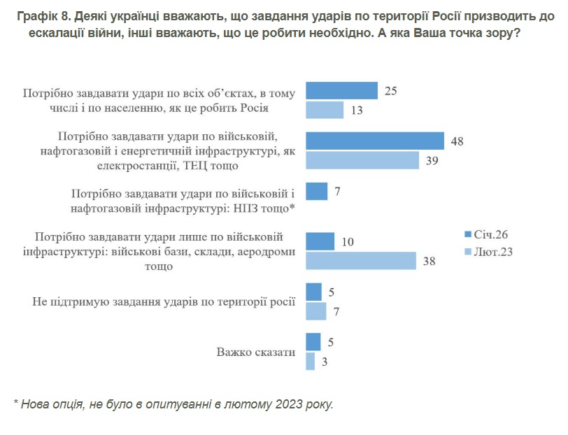 "І в лютому 2023 року, і в січні 2026 року 90% вважають, що Україна має завдавати ударів по території Росії. При цьому із 38% до 10% стало менше тих, хто говорить про удари по лише військових об'єктах. Натомість зараз 80% вважають, що, крім військових об'єктів, Україна має завдавати ударів і по інших об'єктах", – ідеться в релізі.