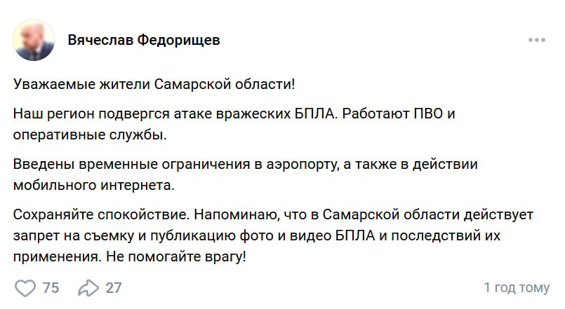 Губернатор регіону В'ячеслав Федорищев у "ВКонтакте" також поінформував про атаку.